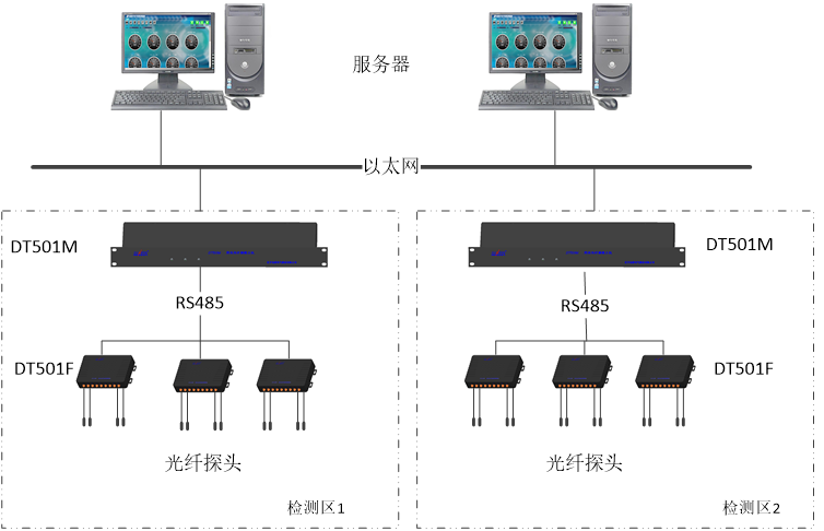 熒光光纖測溫系統(tǒng)由熒光光纖溫度解調(diào)儀(DT-501F)、光纖傳感探頭(DT-S100)、熒光光纖測溫主機(DT-501M)和系統(tǒng)管理軟件4部分組成。其中:光纖傳感探頭(DT-S100)將檢測位置的溫度信息轉(zhuǎn)換成光信號;熒光光纖溫度解調(diào)儀(DT-501F)實時接收光纖傳感探頭送來的攜帶溫度信息的光信號,將其解調(diào)成溫度值,實現(xiàn)對被檢測部位溫度測量;熒光光纖測溫主機(DT-501M)通過RS485總線方式連接多個熒光光纖溫度解調(diào)儀,將溫度信息、超溫報警信息以及系統(tǒng)狀態(tài)信息進行數(shù)據(jù)匯總,通過以太網(wǎng)傳輸?shù)较到y(tǒng)管理軟件;系統(tǒng)管理軟件控制和顯示相關(guān)的溫度以及數(shù)據(jù)變化。