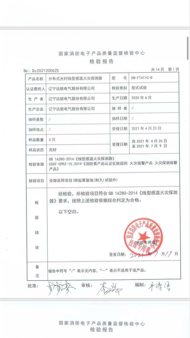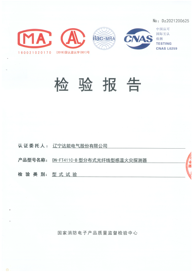 近日,達(dá)能電氣集團(tuán)旗下產(chǎn)品—《DN-FT411C-B型分布式光纖型感溫火災(zāi)探測器》通過國家“國家消防電子產(chǎn)品質(zhì)量監(jiān)督檢驗(yàn)中心”檢測并取得檢驗(yàn)報告,標(biāo)志著公司核心產(chǎn)品質(zhì)量滿足國家檢測條件,達(dá)到行業(yè)高標(biāo)準(zhǔn)水平,產(chǎn)品檢驗(yàn)項(xiàng)目符合相關(guān)標(biāo)準(zhǔn)要求。
