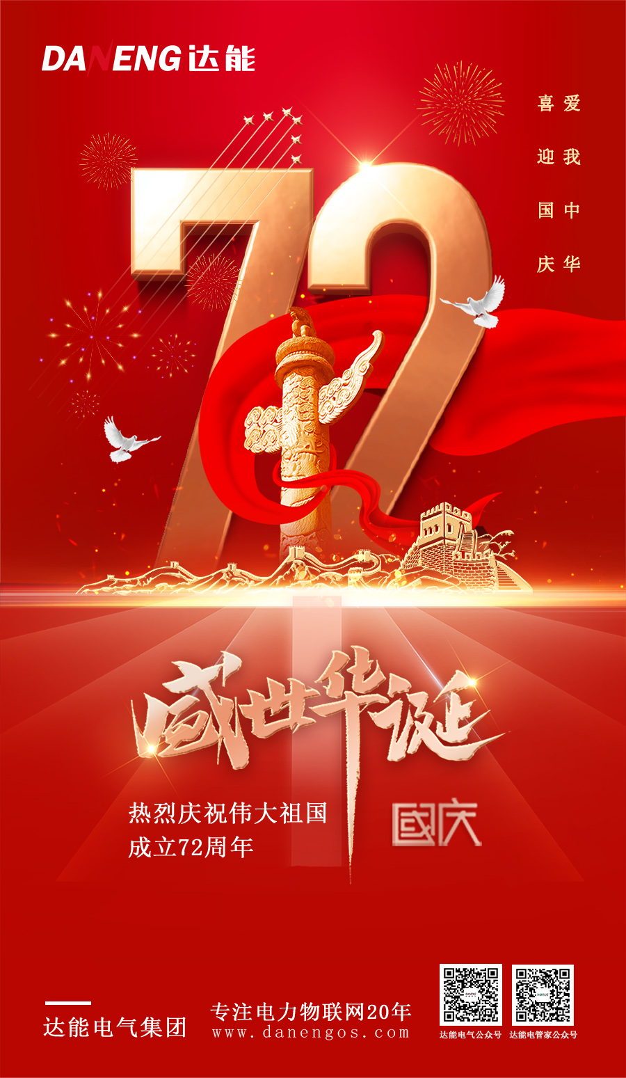 錦繡中國,盛世華誕,舉國同慶,共祝中華!天降祥瑞山河紅,耀顯泱泱大國興。達(dá)能電氣集團熱烈慶祝祖國成立72周年,祝愿偉大祖國繁榮昌盛!