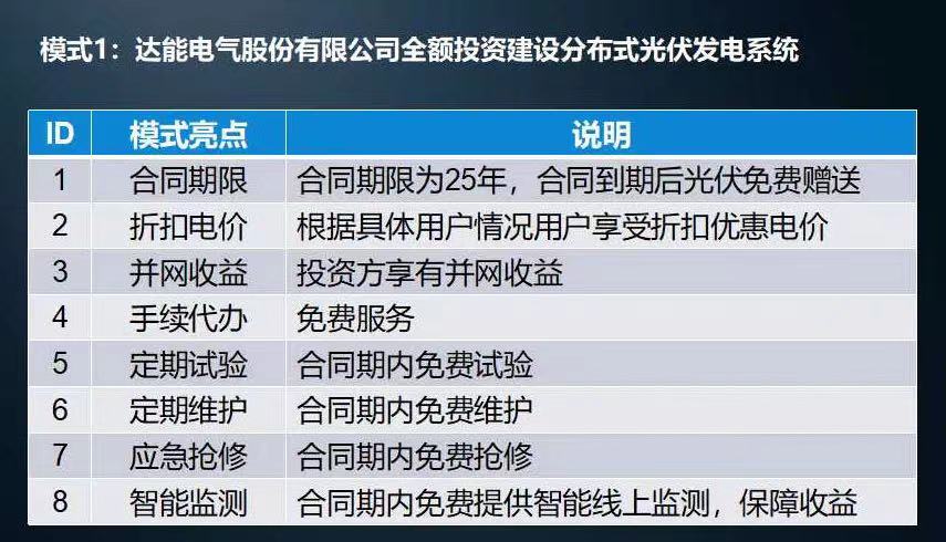達(dá)能電氣提供兩種光伏發(fā)電合作模式,可選擇企業(yè)自建及合同能源管理模式。企業(yè)采用自投模式,在發(fā)電全消納的情況下,約3-4年左右時(shí)間回本,電站可連續(xù)發(fā)電25年,發(fā)電收益有保證。企業(yè)也可采用合同能源管理模式,由第三方進(jìn)行投資建設(shè),減少一次性投資支出,電站發(fā)電優(yōu)先供企業(yè)使用,比享受8.5-9折目錄電費(fèi)優(yōu)惠。