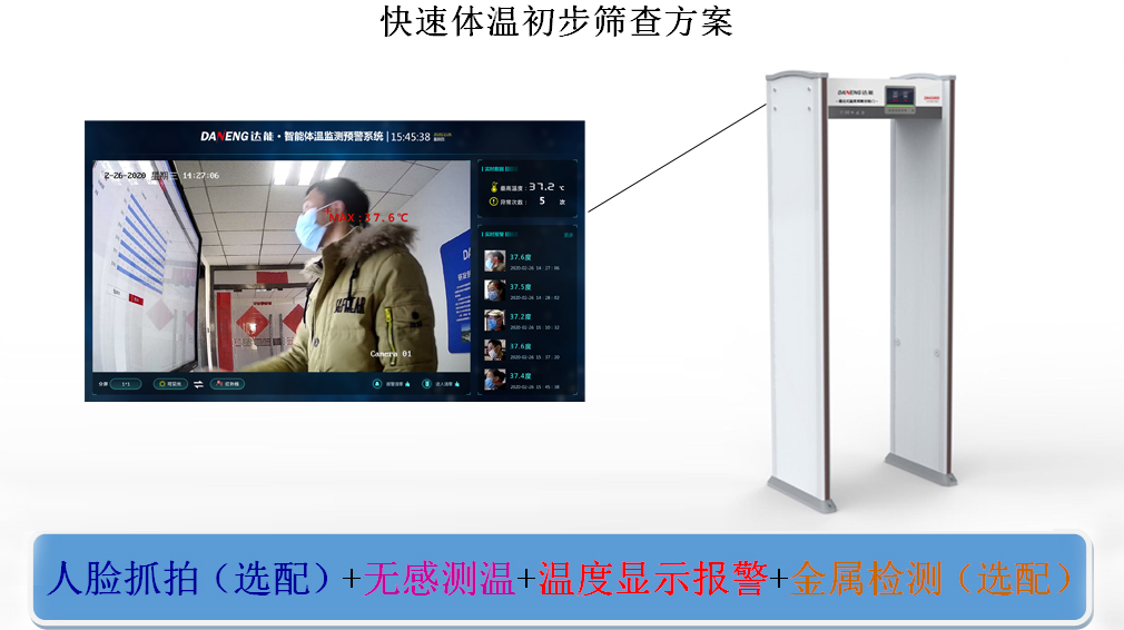 達能電氣專為疫情防控研發(fā)與生產(chǎn)的這款門式紅外體溫監(jiān)測儀,可通過非接觸式測溫,實現(xiàn)通過人員和溫度的準(zhǔn)確匹配,建立首道防線;能夠?qū)^檢人員進行測溫、金屬檢測,是集測溫、金屬檢測于一體的全自動紅外體溫測溫儀。可快速篩選,有效降低檢測工作量,提升效率。門式紅外體溫監(jiān)測儀便于篩檢具有發(fā)熱癥狀的病人以減少傳染和疫情蔓延,適合于出入境口岸、機場、車站、碼頭、醫(yī)院、機關(guān)、工廠、學(xué)校、賓館和寫字樓等公共場所人體溫度的檢測。
