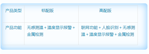 此設(shè)備提供兩種選型,可根據(jù)預(yù)算和應(yīng)用場景選擇不同設(shè)備選型,主要差別在于測溫距離的遠近,同時測溫人員的數(shù)量,熱成像分辨率,聯(lián)網(wǎng)人臉識別等。