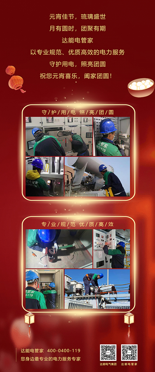 元宵佳節(jié),琉璃盛世,月有圓時,團(tuán)聚有期。達(dá)能電管家以專業(yè)規(guī)范、優(yōu)質(zhì)高效的電力服務(wù)守護(hù)用電,照亮團(tuán)圓!達(dá)能電管家秉承“第一時間發(fā)現(xiàn)問題,第一時間響應(yīng)問題,第一時間解決問題”的服務(wù)宗旨,24小時電力運維熱線:400-0400-119。